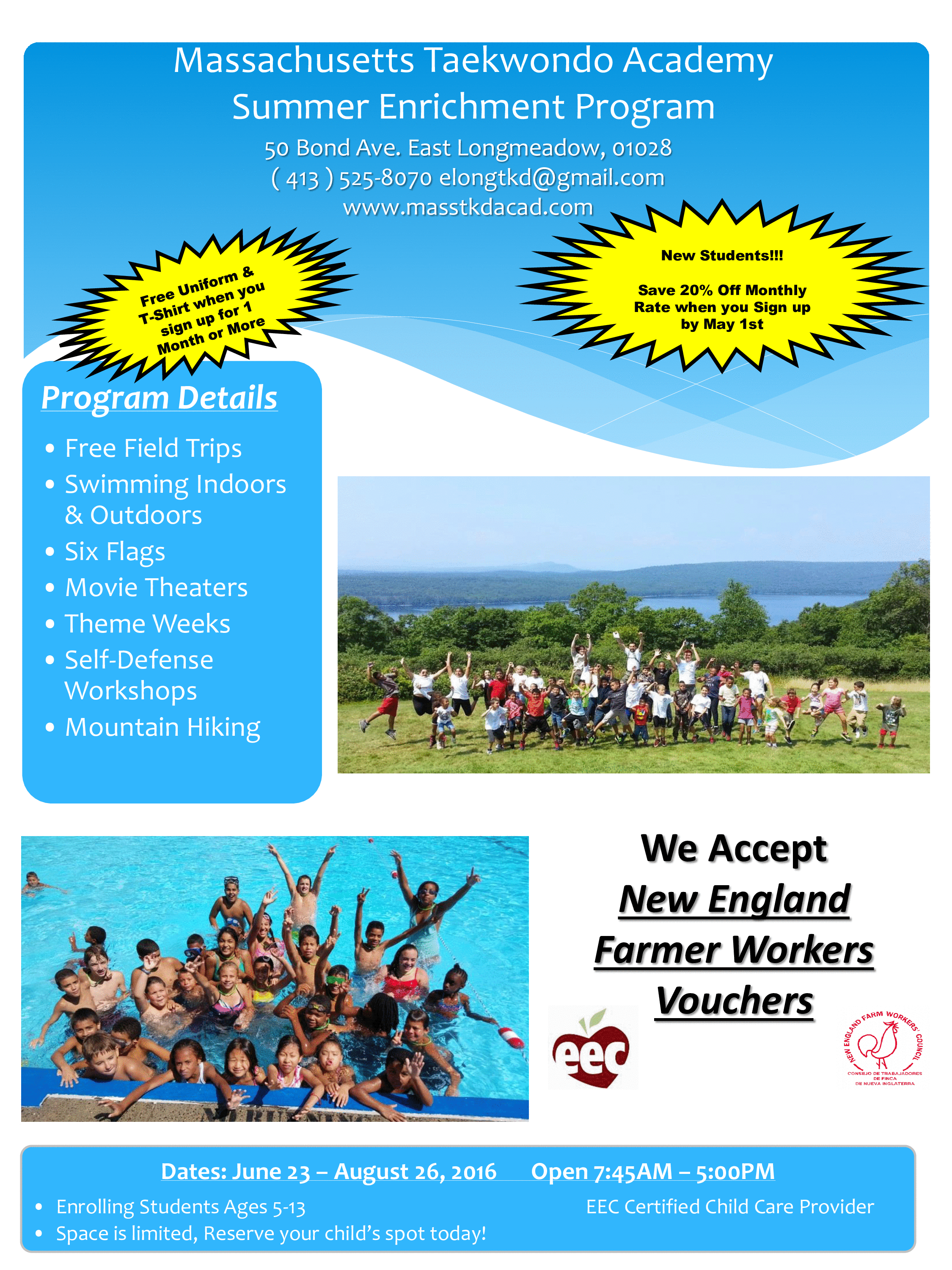 Call or email for more information or to register. 413-545-8070 or ELONGTKD@GMAIL.COM